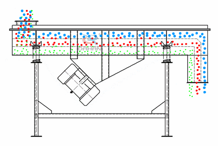 大豆是一種顆粒狀物料,一般采用直線振動(dòng)篩進(jìn)行篩分。黃豆直線振動(dòng)篩采用雙振動(dòng)電機(jī)驅(qū)動(dòng),當(dāng)兩臺(tái)振動(dòng)電機(jī)做同步、反向旋轉(zhuǎn)時(shí),其偏心塊所產(chǎn)生的激振力在平行于電機(jī)軸線的方向相互抵消,在垂直于電機(jī)軸的方向疊為一合力,因此篩機(jī)的運(yùn)動(dòng)軌跡為一直線。兩電機(jī)軸相對(duì)篩面有一傾角在激振力和物料自重力的合理作用下,進(jìn)入設(shè)備的物料在篩面上被拋起、跳躍式向前做直線運(yùn)動(dòng),通過多層篩網(wǎng)產(chǎn)生數(shù)種規(guī)格的篩上物、篩下物,分別從各自的出料口排出,達(dá)到篩選和分級(jí)的目的。為了讓大家更方便的了解直線振動(dòng)篩,以下為大家詳細(xì)介紹下直線振動(dòng)篩的結(jié)構(gòu):直線篩主要由篩箱、篩框、篩網(wǎng)、振動(dòng)電機(jī)、電機(jī)臺(tái)座、減振彈簧、支架等組成。