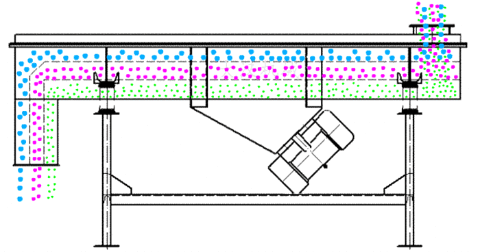 高頻直線篩采用雙振動電機驅(qū)動,當物料從給料機均勻地進入篩分機的進料口,在振動電機的激振下,向出料口方向邊跳動邊篩分,通過多層篩網(wǎng)篩分出數(shù)種產(chǎn)品和不合格的篩上、篩下物,分別從各自的出口排出,流入料倉或盛料筒,從而達到對物料進行篩選和分級的目的。