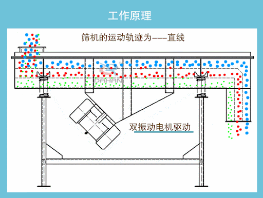 不銹鋼直線振動(dòng)篩工作原理可分為動(dòng)力來(lái)源、運(yùn)動(dòng)傳遞、物料分離三個(gè)環(huán)節(jié),雙軸振動(dòng)電機(jī)為設(shè)備提供動(dòng)力、篩體作直線往復(fù)振動(dòng)進(jìn)行動(dòng)力傳遞,在直線振動(dòng)和篩面傾角的共同作用下,會(huì)經(jīng)歷分層-透篩-分離的過(guò)程。